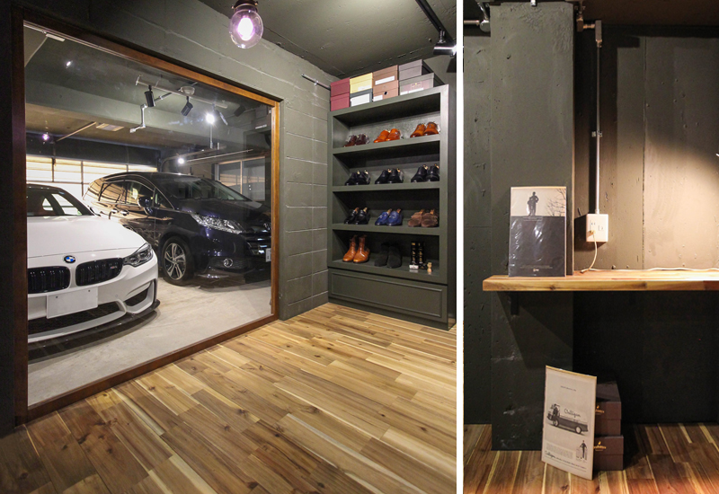 インナーガレージに面した納戸を、男の隠れ家風に。ご主人の趣味である車を眺められるように、大きなガラスをはめ込みました。インテリアのテーマは“ダンディーな紳士服店”です。