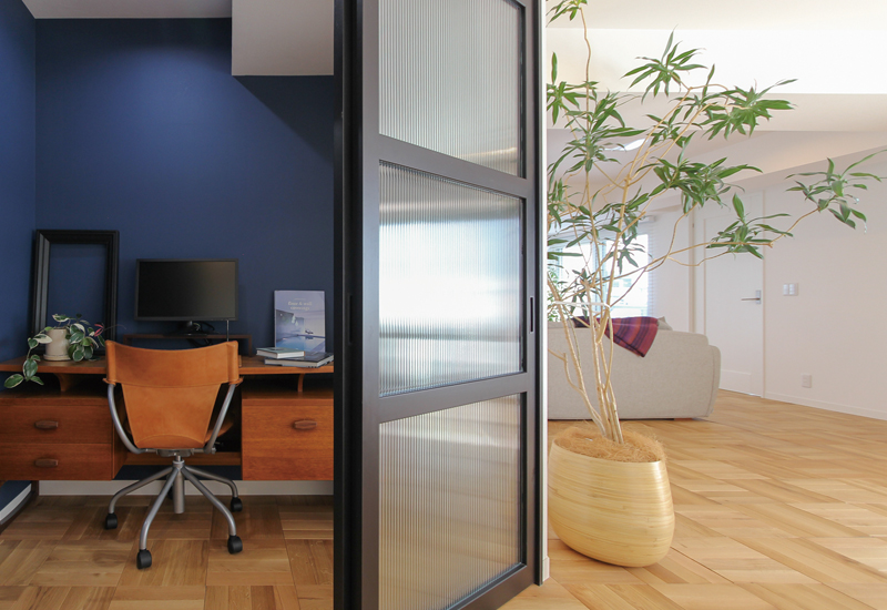 リビングをガラスのパーテーションで仕切ったら、そこだけ別世界。プライベートと仕事の時間を切り離しながら、家族の気配は感じられる書斎ができました。