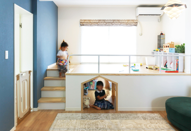 天井の高さを生かして設けた、小上がりの収納スペース。内部には照明もあり、入口の形状に遊び心を。お子様が小さいうちは、恰好の遊び場に。