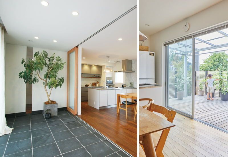 リビングのガラス引き戸を開ければ、ひとつなぎの続き間になるインナーテラス。開放感と明るさ、通風をもたらします。ウッドデッキの場合は、空の下にお部屋が一つ増えたような感覚に。