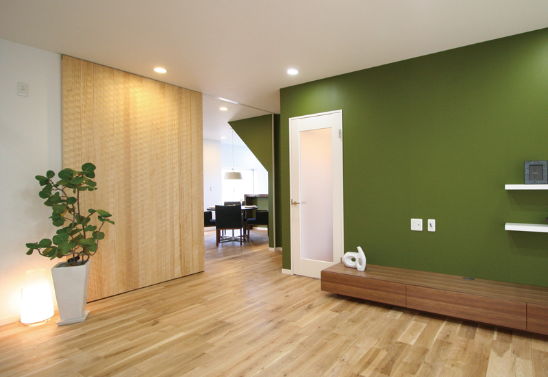 1枚ものの大きな引き戸。閉めた時は、木目の美しい壁のように。