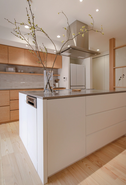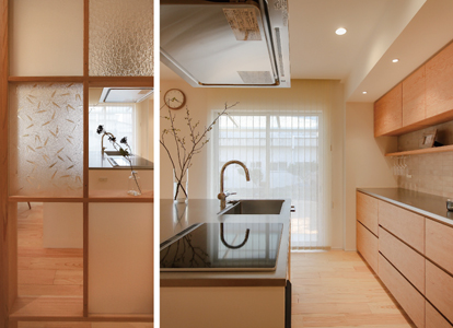 ダイニングキッチン横には柱を活かした飾り棚を新設。空間を仕切るブラインドの役割を果たしています。以前の家で使用されていた模様ガラスをはめ込んだ、“世界にひとつ”のオリジナルです。