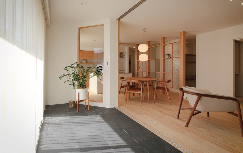 青い瓦屋根がノスタルジックなA様邸は、奥様のお母様とご夫婦が3人で暮らすために購入された中古の木造平屋建。JYUKOBOがご提案したリノベーションプランに、「一目惚れ」「同じ家がこんなに変わるなんてワクワクする」と、おっしゃってくださいました。まずは耐震補強をしっかりと施し、築50年のこの家に安心してお住まいいただけるように構造から見直しました。既存の骨組みを活かしながら使い勝手の向上を目指す改装です。生まれ変わったお住まいの中心は、インナーテラスの引き戸を開放すると23帖の大広間になるLDK。戸を閉めたままで光を採り入れられるバーチカルブラインドを採用して明るさもしっかり確保しました。キッチンはJYUKOBOオリジナルのミニマルキッチン。Bosh食洗機やグローエの水栓一体型・電解水素水整水器をビルトインするなど、機能にもこだわっています。